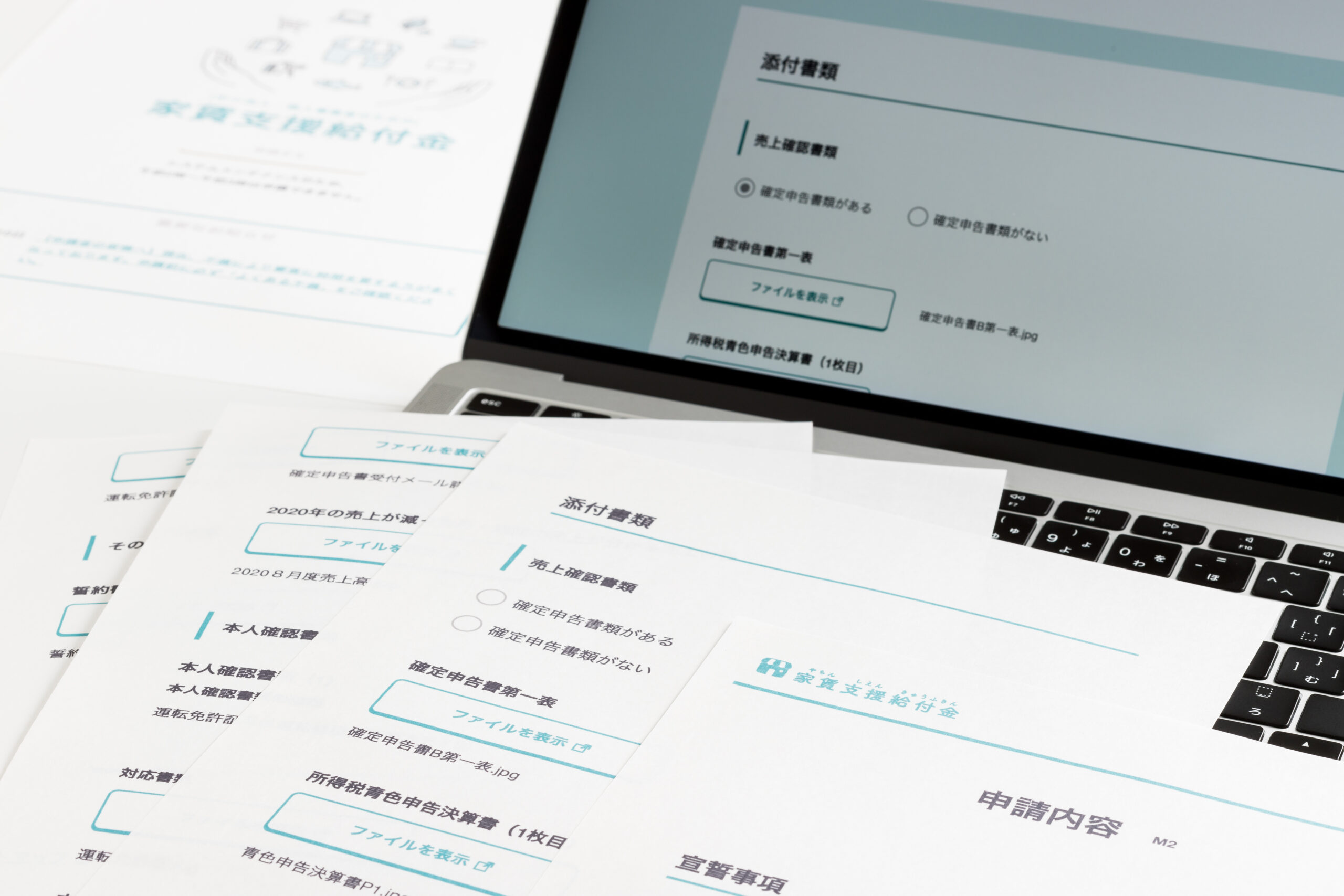 帳簿書類については、「対象月の売上が分かる書類」「基準期間5か月間の売上が分かる書類」が必要となります。