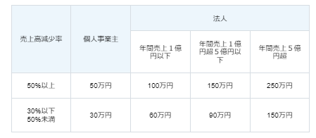 上記のように、個人事業主に対する支給額の上限額が30万円~50万円なのに対し、法人に対する支給額は60万円~250万円となっており、法人のほうが多く設定されています。